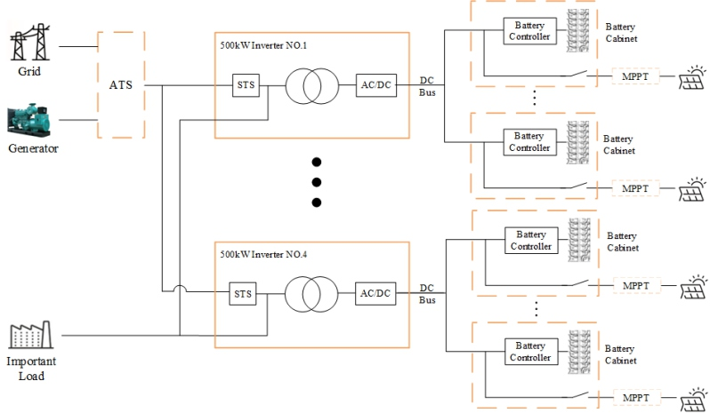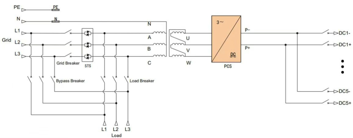1. Bij belastingen groter dan 500 kW wordt aanbevolen om een 500 kW energieopslagomvormer met grote capaciteit te gebruiken, die in staat is maximaal vier sets parallelle verbindingen te ondersteunen, waardoor een totaal uitgangsvermogen van 2 MW wordt bereikt;