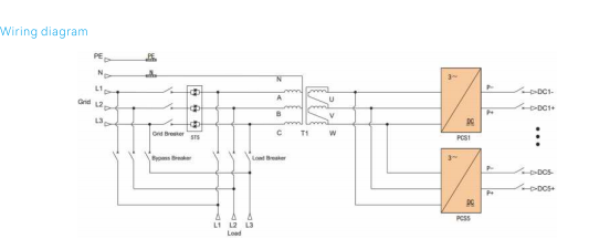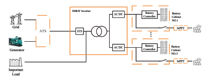 Functie Het systeem maakt gebruik van modulaire inverterunits in parallelle configuratie de DC-ingang van elke invertermodule komt overeen met een speciale batterijkast, waardoor beheer per cluster mogelijk is om circulatiestromen tussen clusters te elimineren batterij snaren. De AC/DC-vermogensmodules ondersteunen een flexibele inzet, zowel in aantal als in aantal vermogen, met een maximale capaciteit van 60 kW modules in een parallelle opstelling van 5 eenheden configuratie. De AC-uitvoer van de voedingsmodules wordt geleverd via een transformator geïsoleerde eindtrap, die stroom levert aan de belasting met een sterke weerstand tegen huidige schok. De hybride ESS maakt gebruik van DC-gekoppelde fotovoltaïsche integratie, waardoor een hoog rendement wordt bereikt energieconversie-efficiëntie en geoptimaliseerd voor off-grid scenario's met PV opwekkingscapaciteit groter dan de vraag; MPPT-controllers voor buitengebruik integreer combiner- en MPPT-functionaliteiten in één enkele geharde behuizing. Het complete systeem omvat een ATS-dieselgenerator, een hybride van 300 kW omvormer, PV MPPT-controller en een batterij-energieopslagsysteem.